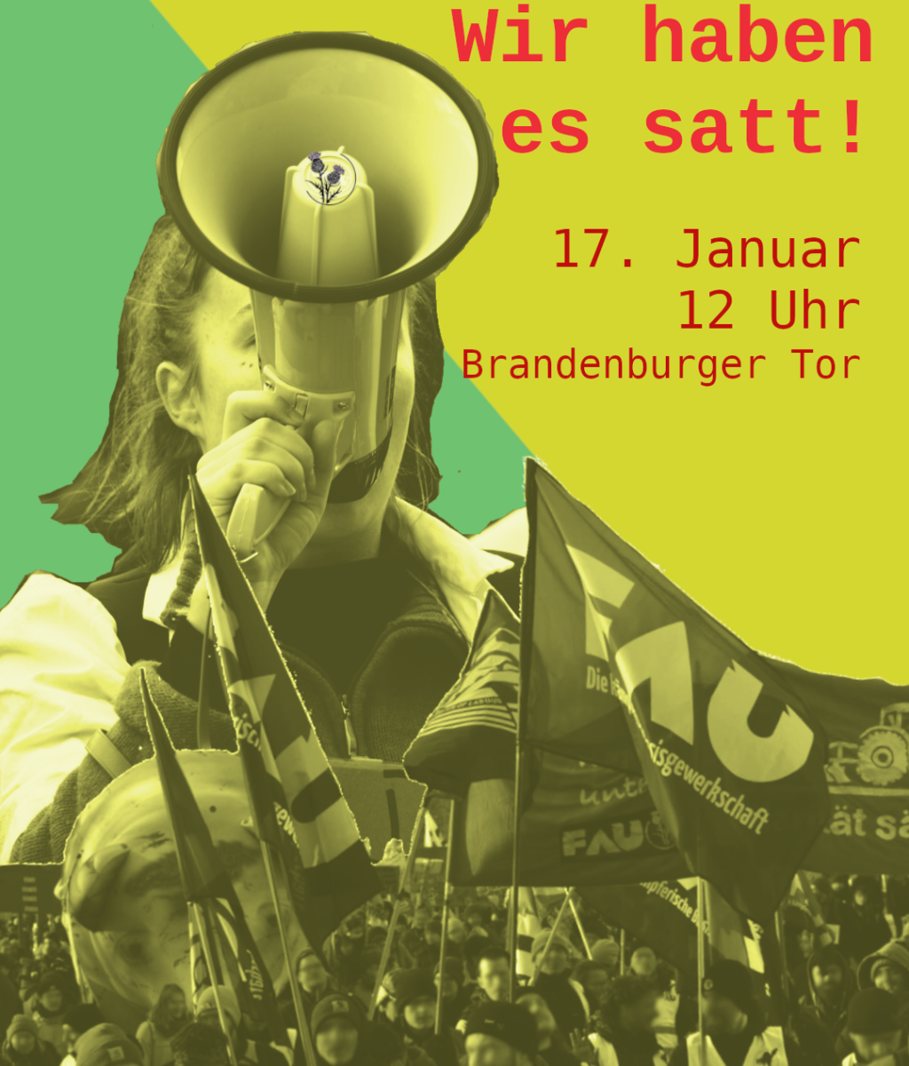 - 17.1.: 9 Uhr – 11:15 Uhr: Frühstück für Beschäftigte aus den Grünen Gewerken @ PA58 | 12 Uhr: Antikapitalistischer Landarbeiter:innen-Block auf der „Wir haben es satt!“-Demo @ Brandenburger Tor | 17 Uhr: Aufwärmen und Ankommen @PA58 | 18 Uhr: veganes Abendessen für alle @PA58 | 19:30 Uhr: Vernetzungsabend mit ELAN, IGG, Interbrigadas, jAbL und anderen @PA58 | danach Ausklang und Übernachtung