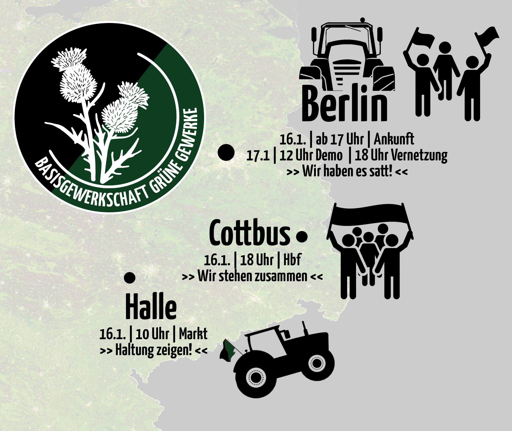 - 16.1.: 10 Uhr Demo in Halle, 18 Uhr in Cottbus, ab 17 Uhr Anreise in Berlin